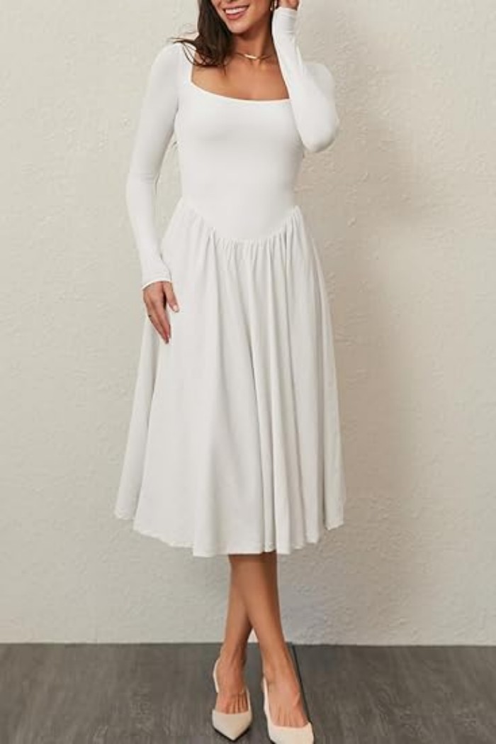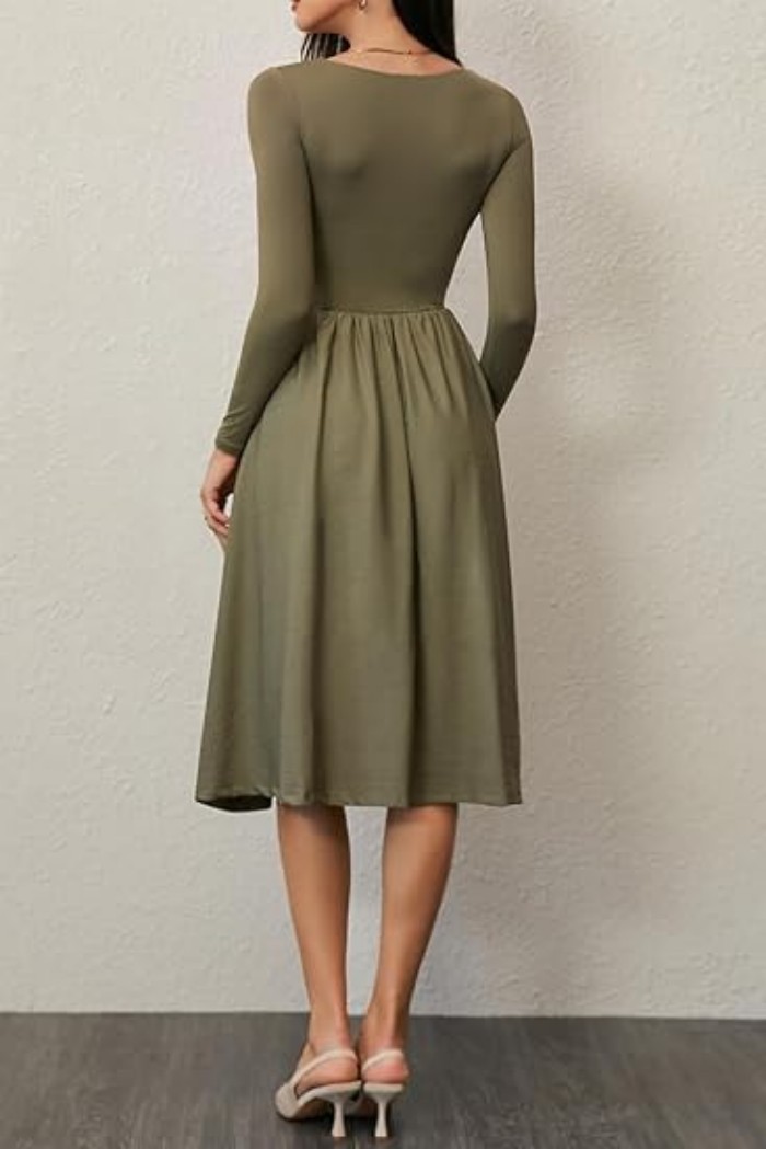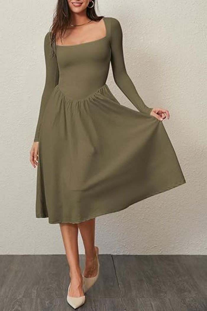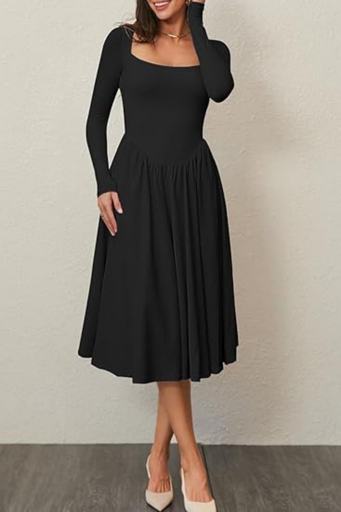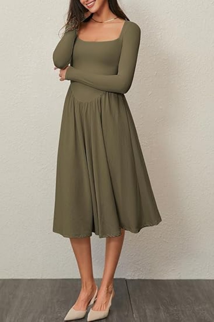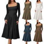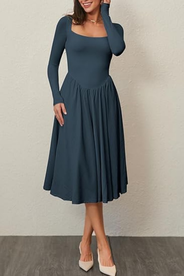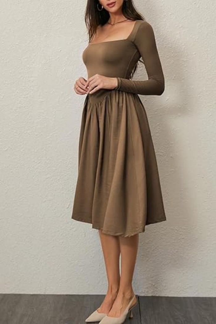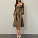 Long Sleeve Solid Color Fitted Square Neck Pleated Dress for Women