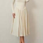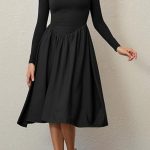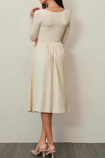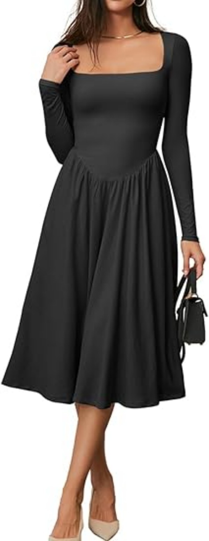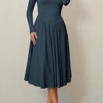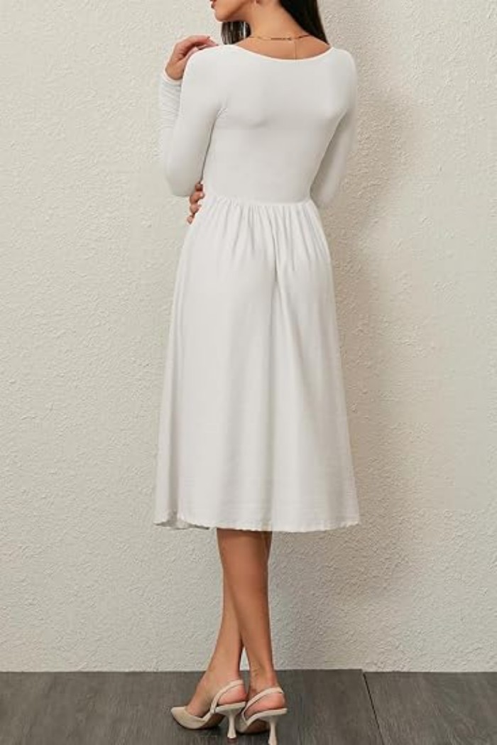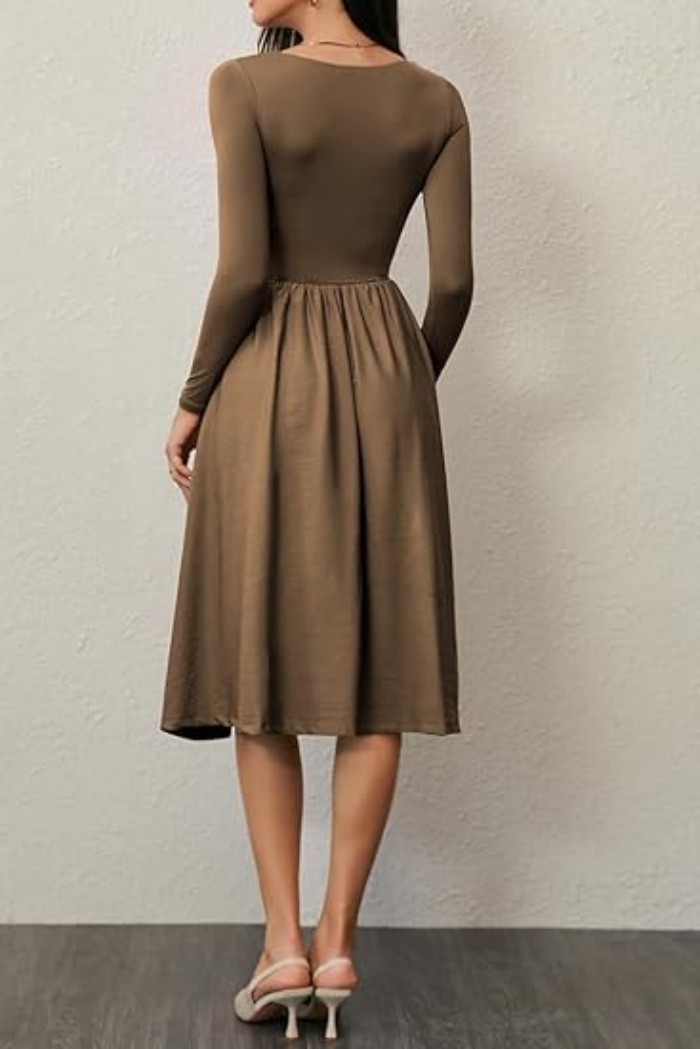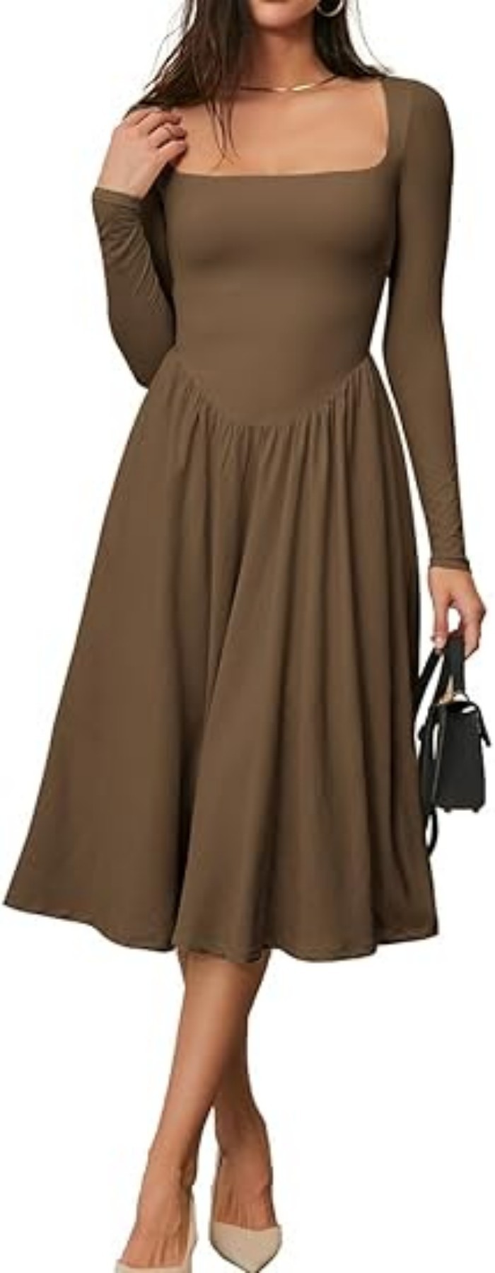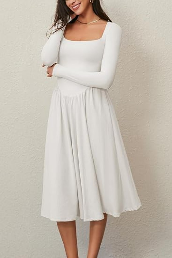 Long Sleeve Solid Color Fitted Square Neck Pleated Dress for Women